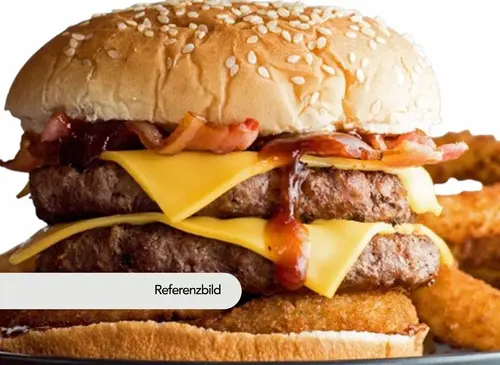 Doppelt Rindfleisch, Homesauce, Salat, Essiggurken, Tomaten, Cheddarkäse, Zwiebel (ACGMN)